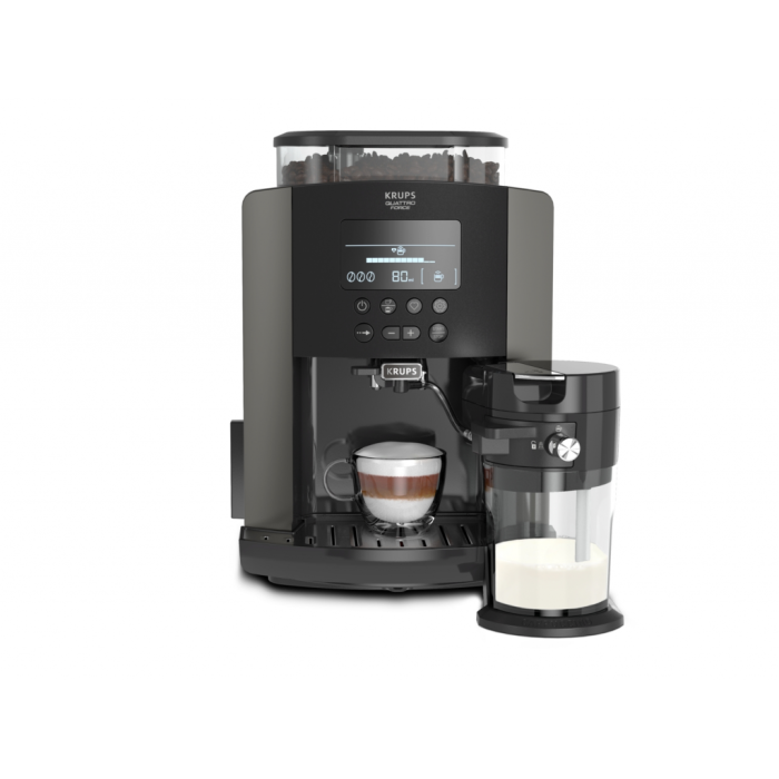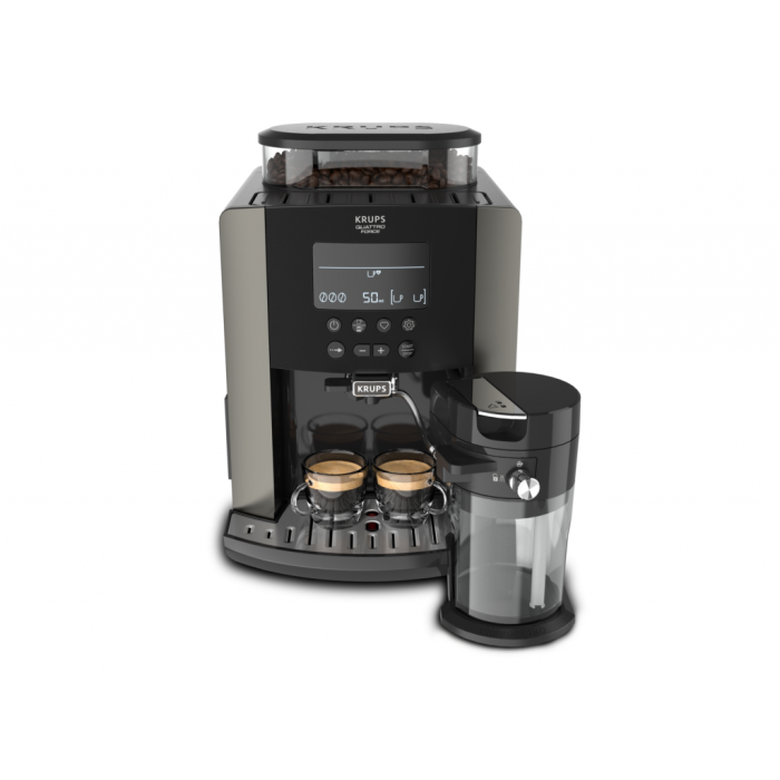 Krups Arabica Latte EA819E10,potpuno automatizirani kafe aparat, veliki LED display.Memorija 4 prilagodljiva recepta.Stainless steel mlin.Odvojivi spremnik za vodu i za kafu.Quatro Force sistem mljevenja.Brzo pokretanje do 30 sec.