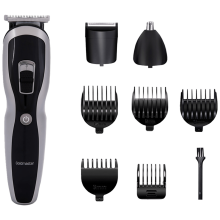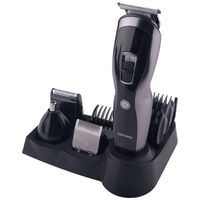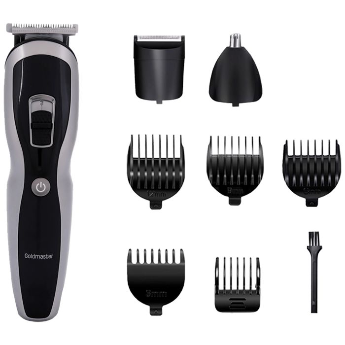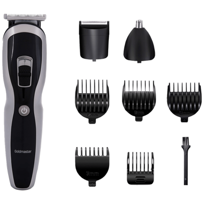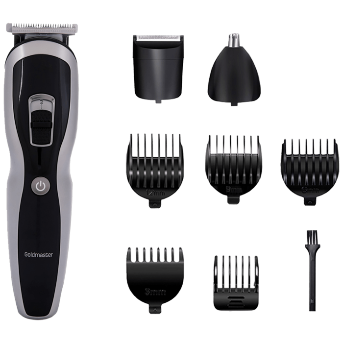 Aparat za brijanje i šišanje, Goldmaster GM-8104, set za njegu muškaraca, može se udobno koristiti kako za šišanje kose tako i za brijanje brade, 4 različite glave za rezanje i 5 češljeva pomažu vam da oblikujete kosu ili bradu kako želite, LED zaslon, Li-Ion baterija, brzo punjenje 2 h, vrijeme rada sa potpuno napunjenom baterijom 60 min., oštrice od nehrđajućeg čelika za dug radni vijek, oblik glave prilagođen koži za brijanje bez iritacije