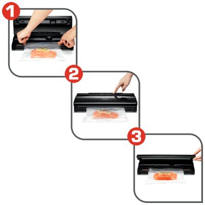 Aparat za vakuumiranje i zatvaranje plastičnih vrećica, snaga 110W, mehanička kontrola, dužina zatvaranja 31 cm, širina zatvaranja 1 cm, veličina kese 30 cm, funkcija vakuumiranje i zatvaranej, funkcija samo zatvaranje, stop funkcija, 18 kesica uključeno u pakiranje ( 10 kesica 22 x 30 cm, 8 kesica 28 x 25 ), prostor za odlaganje kabela, boja crna