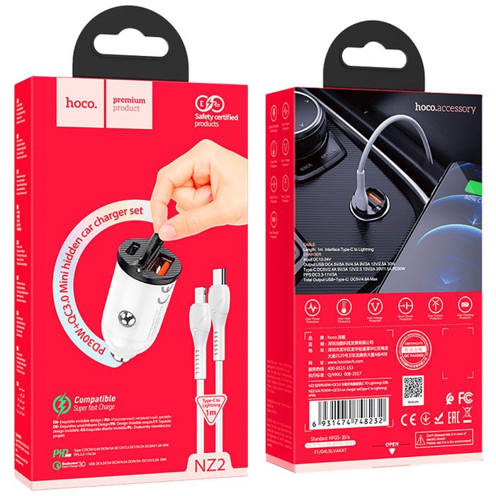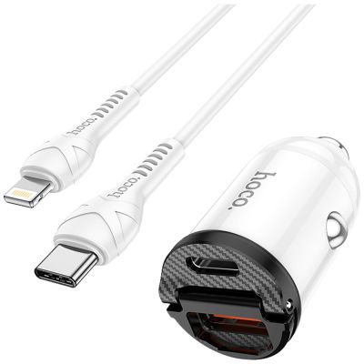 hoco. Auto punjač sa Lightning kabelom, PD + QC3.0, 2 x USB, 4.8 A - NZ2 Link, type C-Lightning, White
