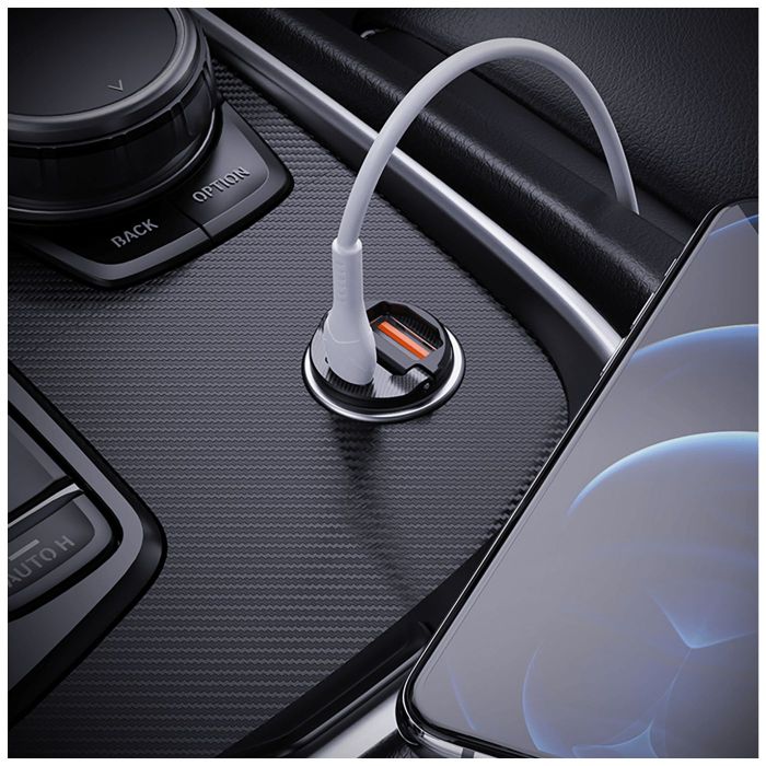 Univerzalni USB Auto punjač sa Lightning kabelom, brzi punjač standard PD + QC3.0, 2 x USB, ulazni napon 12-24 V, izlazni napon USB-A: 30W, Type-C PD 30W, USB-A + Type-C 5V / 4.8A, dimenzije 42.5 x 22 mm, tezina 32 g, dužina kabela 1 met.