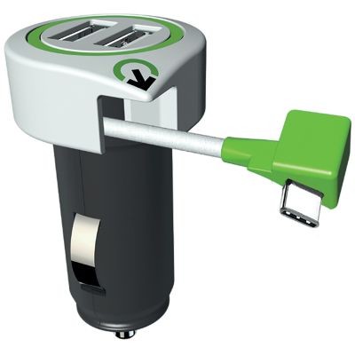 Univerzalni USB Auto punjač, 2 x USB utor, type C konektor, dužina kabela 18cm, ulazni napon 12V - 24V, izlazni napon 5V / 3.1A