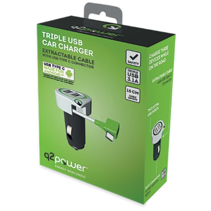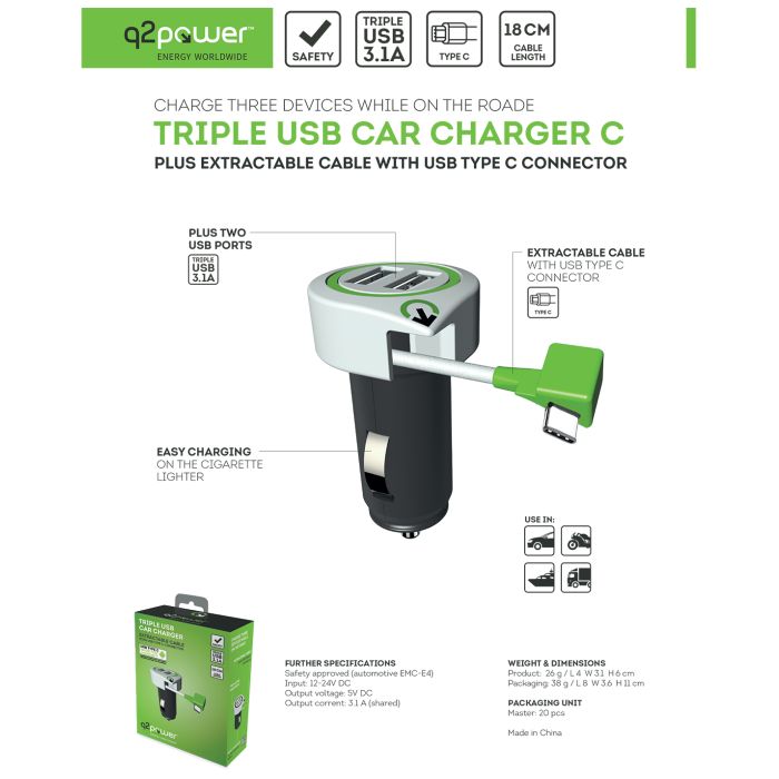 q2power Auto punjač, Dual USB, 3.1A, type C konektor - TRIPLE USB CAR CHARGER C