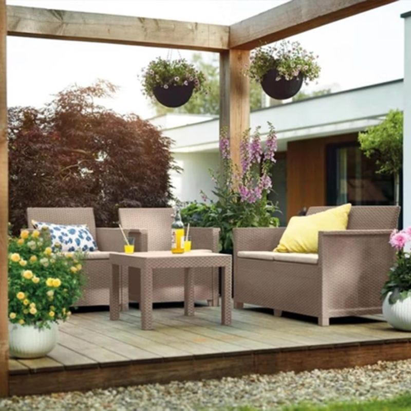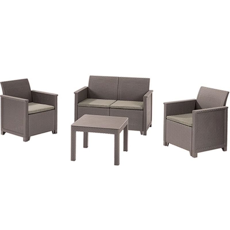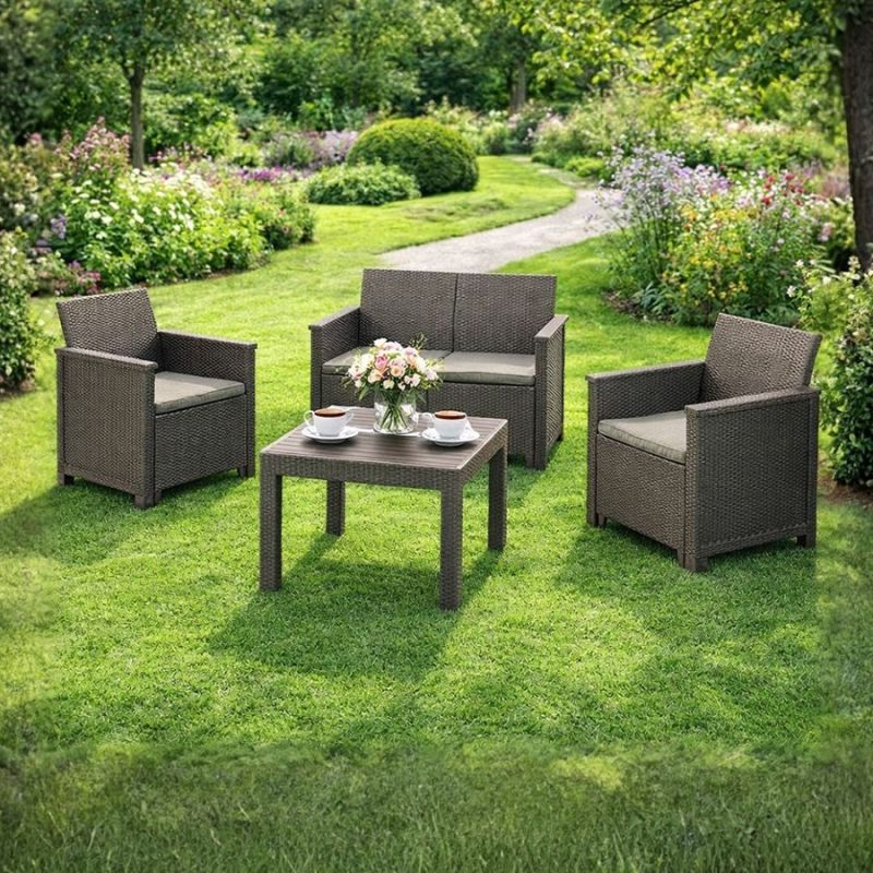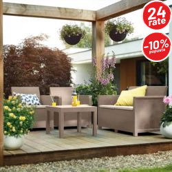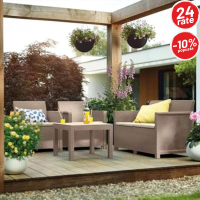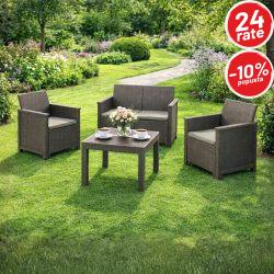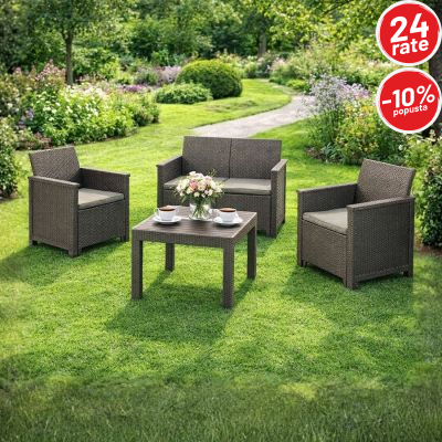 Set je izrađen od kvalitetne plastike sa izgledom ratana, što omogućava dug vijek trajanja, otpornost na vremenske uslove i vrlo jednostavno održavanje. Udobni jastuci koji dolaze u pakovanju dodatno povećavaju komfor, pa je sjedenje ugodno i tokom dužeg boravka na terasi ili u bašti.