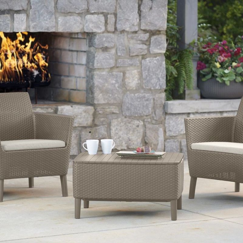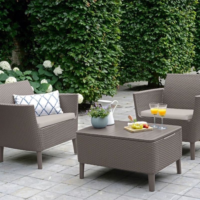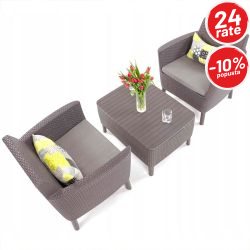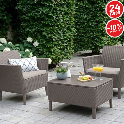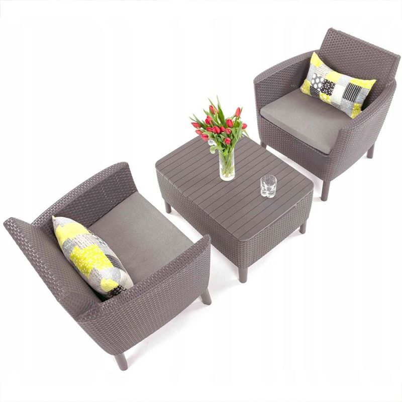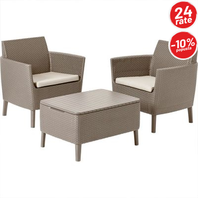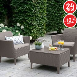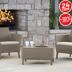 Set se sastoji od dvije udobne fotelje sa jastucima i praktičnog stola sa prostorom za odlaganje, što ga čini idealnim za jutarnju kafu, večernje druženje ili opuštanje na otvorenom. Izrađen je od kvalitetnog materijala otpornog na UV zrake i vremenske uslove, pa je pogodan za korištenje tokom cijele sezone uz minimalno održavanje.