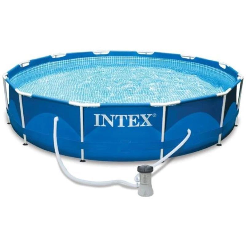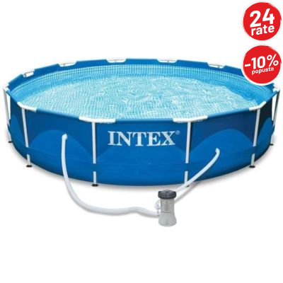 INTEX bazen sa metalnom konstrukcijom prečnika 305cm, dubine 76 cm, kapaciteta 4485 litara vode. Izrađen je od troslojnog extra jakog i otpornog materijala. Posjeduje otvore za priključenje pumpe za čišćenje i cirkulaciju vode.