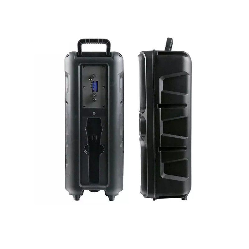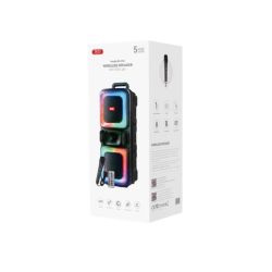 Dodatne funkcije: Posjeduje USB i TF (microSD) ulaze za reprodukciju muzike s eksternih uređaja, kao i AUX ulaz za žičanu povezivost. Također, dolazi s daljinskim upravljačem i žičanim mikrofonom, što ga čini pogodnim za karaoke i druge interaktivne aktivnosti.