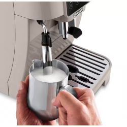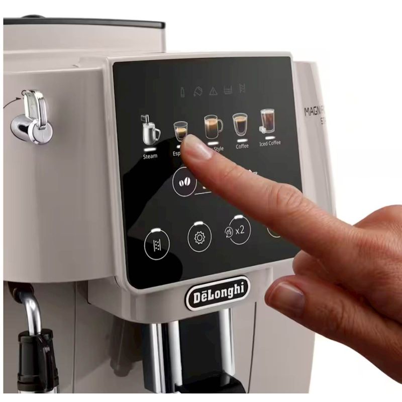 Vaše iskustvo kafe pocinje uz De’Longhi Magnifica Start. Savršeno za ljubitelje kafe koji traže jednostavan uredaj koji priprema espresso napitke barista kvalitete od svježe mljevenih zrna jednim dodirom. Priprema kafe s jednim dodirom – od zrna do šoljice: uživajte u svježoj aromi i bogatom ukusu kafe pripremljene od svježe mljevenih zrna, svaki put. Raznolikost nadohvat ruke: uz 5 napitaka na jedan dodir tipke, ukljucujuci Filter kafu i Kafu s ledom ili Iced Coffee, uživanje u vašim omiljenim napitcima nikada nije bilo jednostavnije. Rucno pripremite kremastu mlijecnu pjenu: tradicionalna pjenjaca za mlijeko omogucuje vam izradu svilenkaste pjene za cappuccino i latte, tacno onako kako volite. Prilagodite ukus: prilagodite aromu baš onako kako volite. Jednostavno za cišcenje, lako za vol