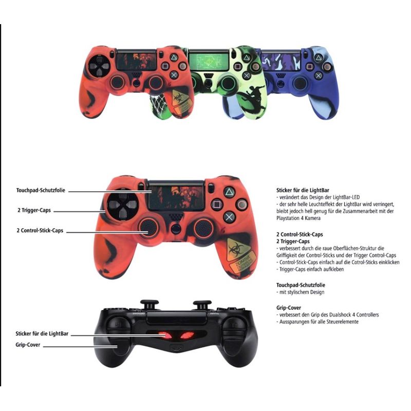 Poboljšava ergonomsko rukovanje sa Dualshock 4 kontrolerom i stilski personalizira kontroler, bez odvrtanja Poklopac rukohvata: Poboljšava prianjanje Dualshock 4 kontrolera Izrezi za sve kontrolne elemente Kompatibilan sa Hama "Multistand" (stavka br. 00115455), "Mini" (stavka br. 00115468) i "Black Thunder" (stavka br. 00115469) stanicama za punjenje Kompatibilan sa "Black Thunder" (artikl br. 00115467) produženom baterijom 2 poklopca kontrolne palice i 2 kapice okidaca: Gruba površinska struktura poboljšava prianjanje kontrolne palice i okidaca Jednostavno kliknite poklopce kontrolne palice na kontrolne palice Jednostavno zalijepite poklopce okidaca Touchpad zaštitna folija: Sa modernim dizajnom Naljepnica za LightBar Mijenja dizajn LightBar LED-a Vrlo jaki svjetlosni efekti LightBar-a s
