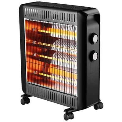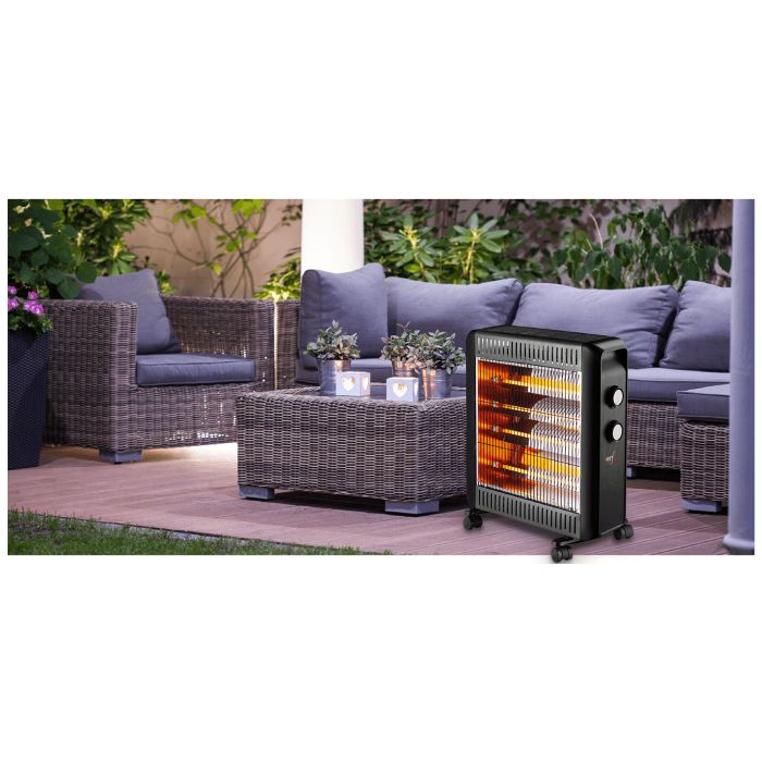 Grijalica sa halogenim ( kvarcnim ) grijačem, podesiva snaga u 2 nivoa 1100 / 2200 W, integrirani termostat, zaštita od pregrijavanja, sigurnost pri prevrtanju, kompaktna i praktična s okretnim kotačima i ručkom za nošenje, IPX4 zasštita, pogodna za upotrebu vani, napajanje 220 - 240 V ~ 50 / 60 Hz, boja crna
