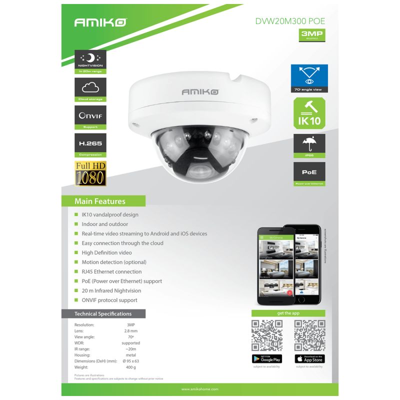 Kamera IP 3 megapiksela, tip kamere Dome, CMOS senzor 1/2.8", Lens 2.8 mm, IR domet 20 metara, fokus fiksni, Infrared LED:14µ x 12, Ethernet 10/100M (RJ45), kut gledanja 65º, H.265 / H.264, aplikacija za smartphone Android / iOS, ONVIF protokol version 2.4, PoE, IK10, IP66 zaštita ( otporna na vodu i prašinu ), metalno kućište, DC 12V / 750mA, radna temperatura -20℃ ~ +60℃, bijela boja