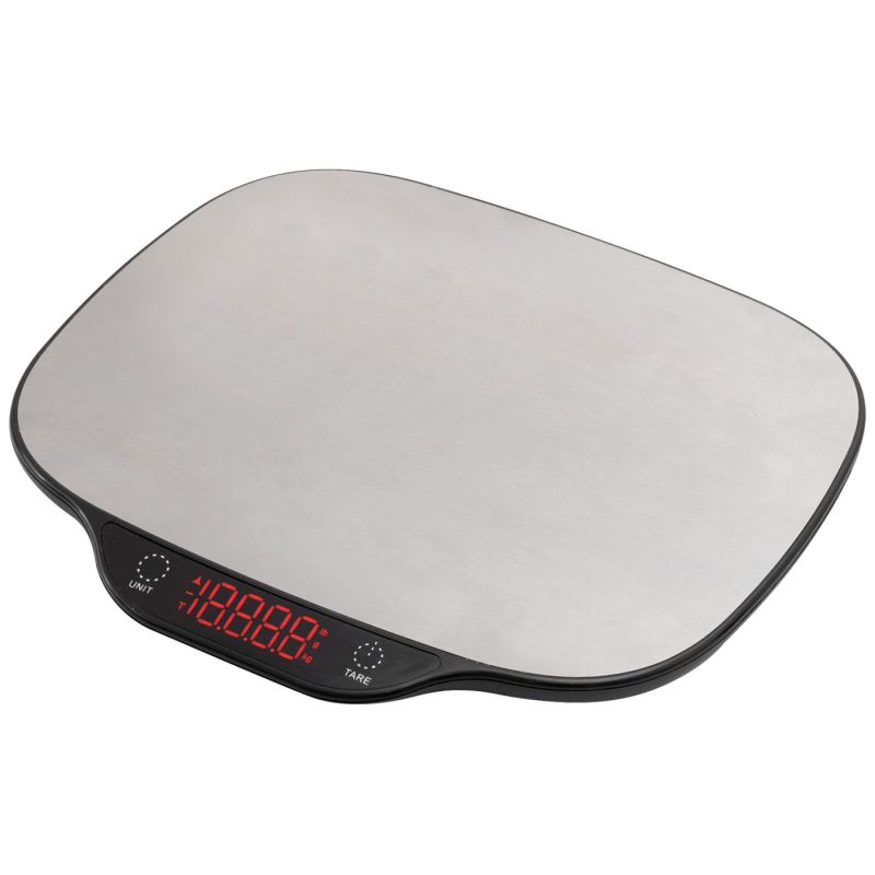 Kuhinjska vaga, Crveni LED zaslon, kapacitet vaganja do 15 kg, točnost vaganja 1 g, TARE funkcija, mjerne jedinice kg / lb / g, automatsko isključivanje, indikacija prazne baterije, indikacija preopterećenja, napajanje 2 x 1,5 V ( AAA ) baterije ( nisu uključene u pakiranje ), dimenzije 270 x 250 x 18 mm