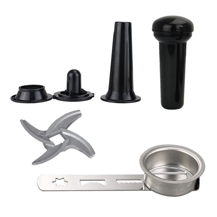 Pribor: rezna ploča: 5 mm (normalno) + 8 mm (grubo), metalni četvrtasti pladanj za hranu, dodatak za kobasice i kibbe, potiskivač hrane