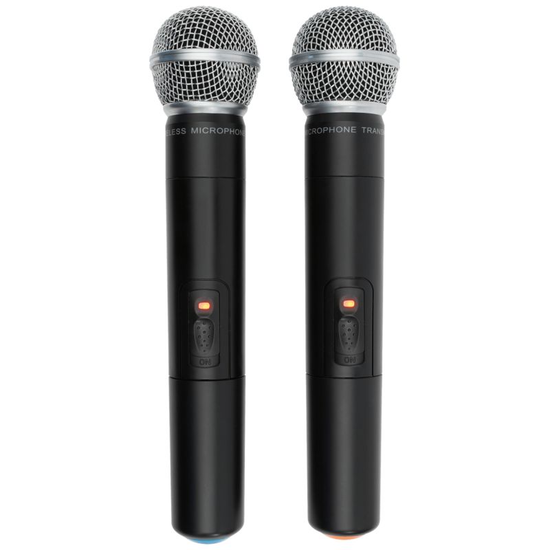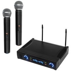 Set 2 bežična mikrofona i prijemnik , domet do 100 met. ( na otvorenom ), radna frekvencija 518 - 766 MHz, audio izlaz 0 - 500 mW, osjetljivost 105 dB, sučelje XLR / Ø6.3 mm jack, dimenzije: mikrofon Ø55 / 45 x 240 mm, prijemnik 210 x 45 x 140 mm, napajanje : mikrofon 2 x AA baterije ( nisu uključene u pakiranje ), prijemnik 100 - 240 V ~