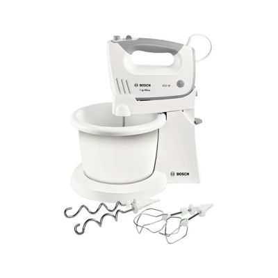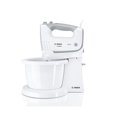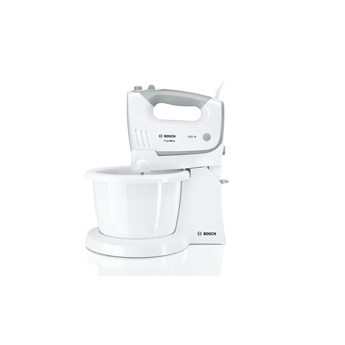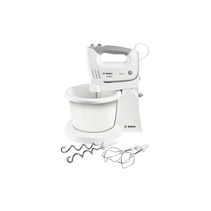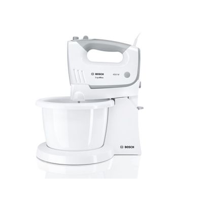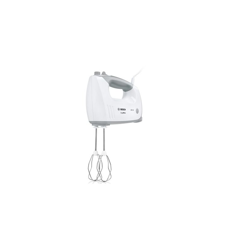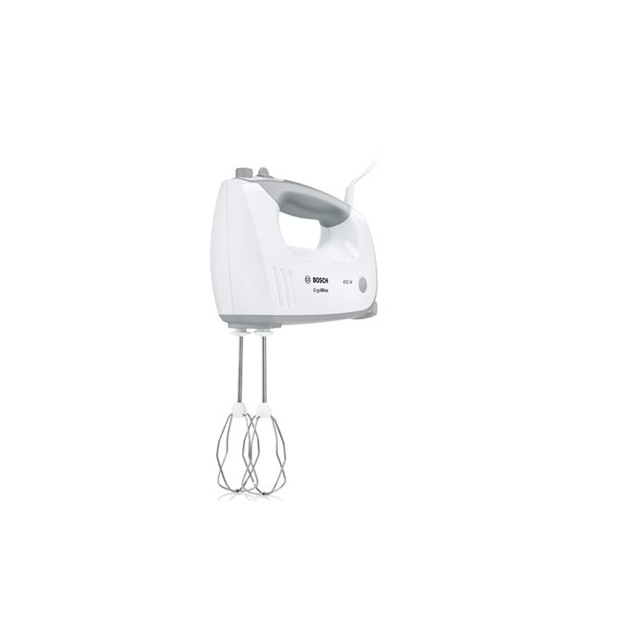 BOSCH mikser MFQ36460S ErgoMixx, Boja: BIJELA/SREBRNA ; 450W, 5 Brzina + Turbo ; Postolje s automatski okretnom zdjelom; Pribor: 2 standardne metlice; 2 kuke za miješanje, SL