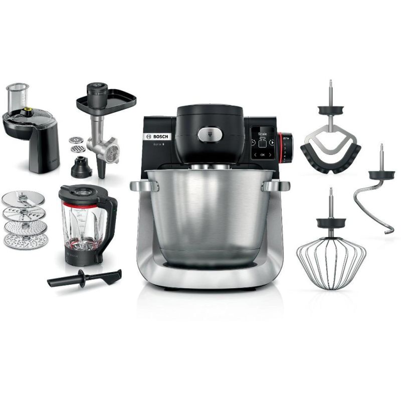 BOSCH kuhinjski aparat MUMS6ZS34 MUM 6 CRNA-INOXA 1600W,5,5L, VAGA, 7 Brzina, NOVI DIZAJN,Ugrađena vaga: Prikazuje korake od 1 g, dodatno mjeri ml, mlmlijeka, ml ulja, g, oz