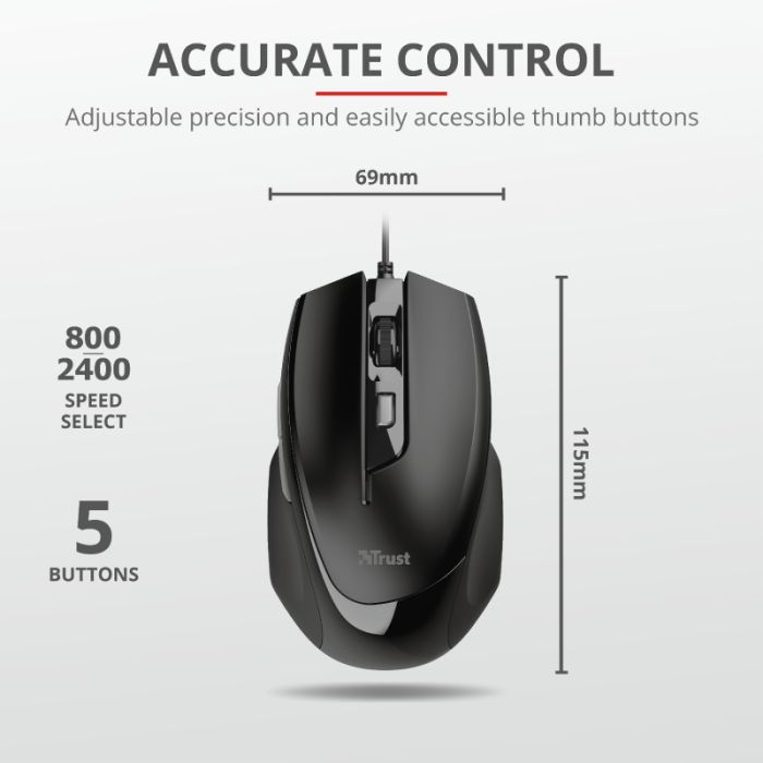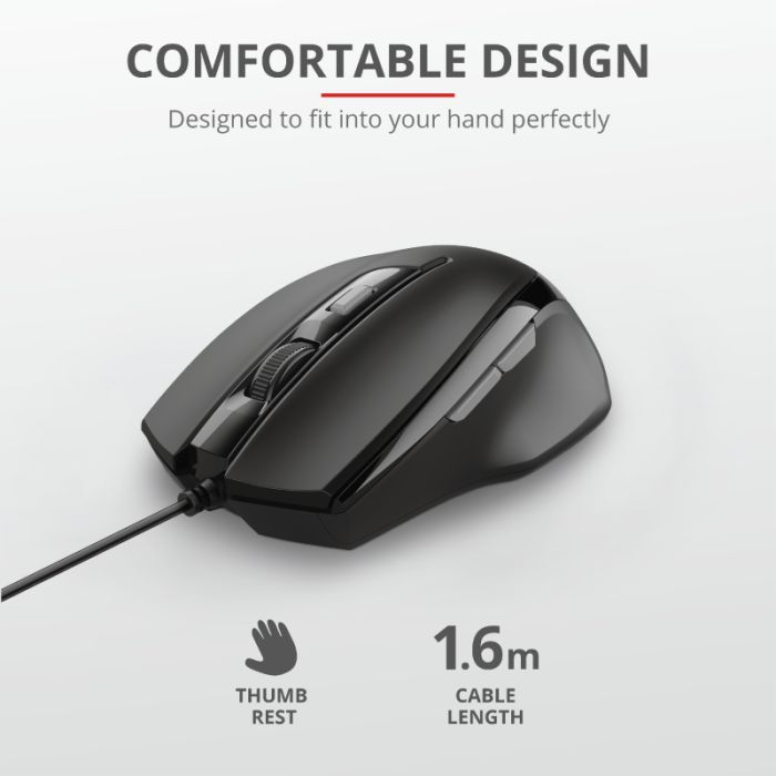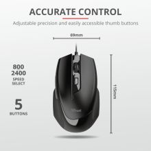 Trust Voca Comfortable Miš, žičani, easy-to-use, crni, 800-2400 DPI, optički, 6 tipki, usb 2.0, 1.6 m