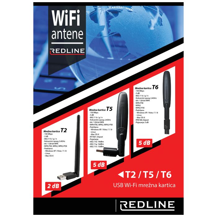 REDLINE Wi-Fi mrežna kartica, USB, 2.4 GHz, 5 dB, 150 Mbps, RTL8188 - T6 WiFi antenna