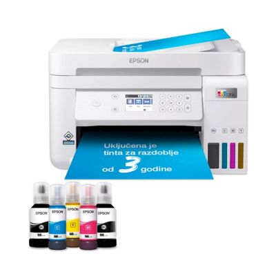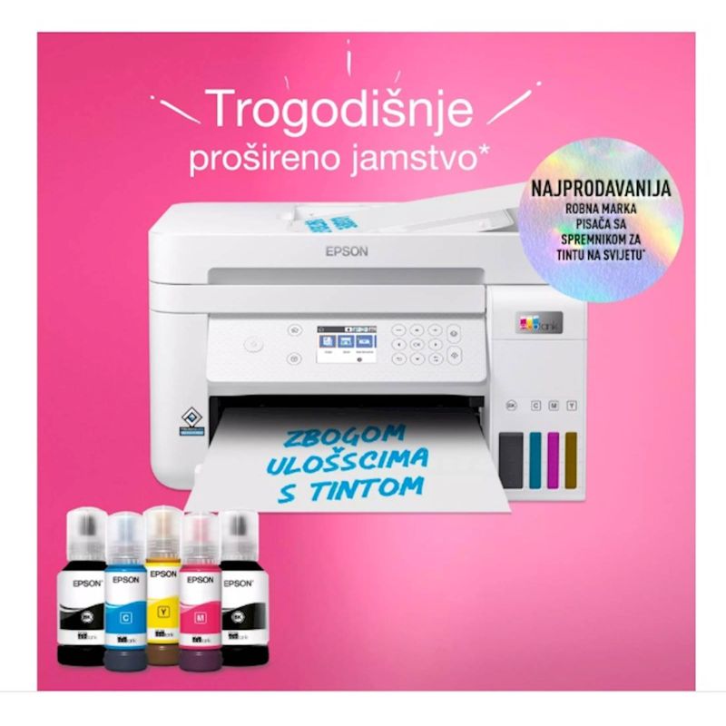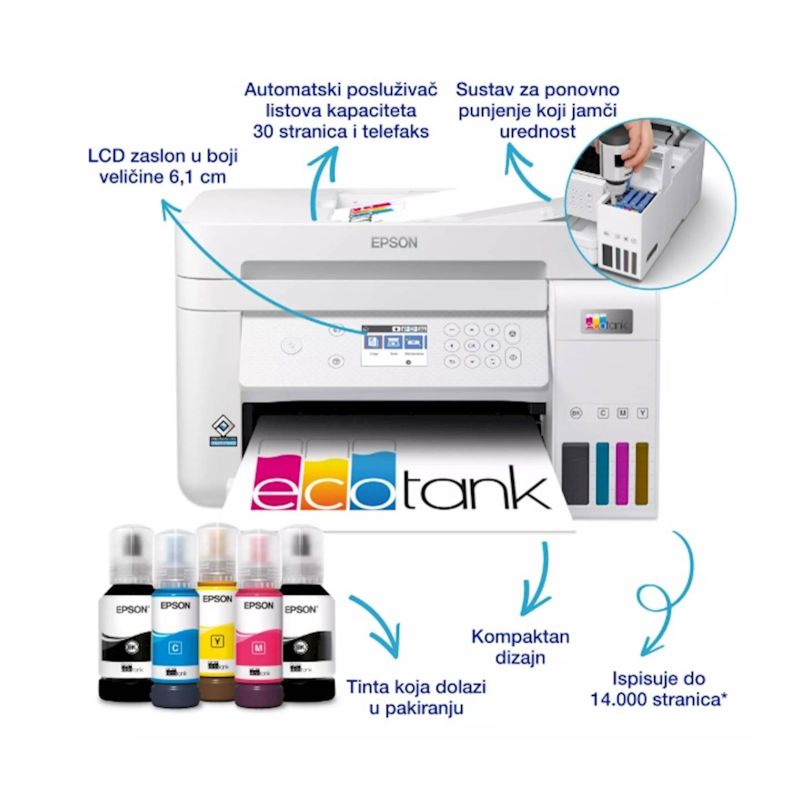EPSON EcoTank L6276 - Praktican ispis bez stresa sa spremnicima za tintu u trajanju do 3 godine ukljucenim u pakiranje. Osigurava ispis bez muke za domove i male urede. S LCD zaslonom u boji promjera 6,1 cm automatskim obostranim ispisom i ulagacem listova od 30 stranica, prednjom ladicom za papir za 250 stranica i brzinama ispisa do 15,5 stranica u minuti - možete s lakocom ubrzati razlicite zadatke.