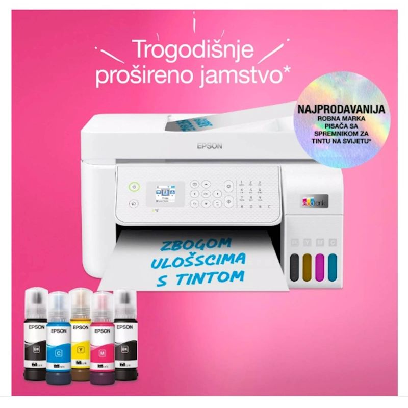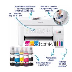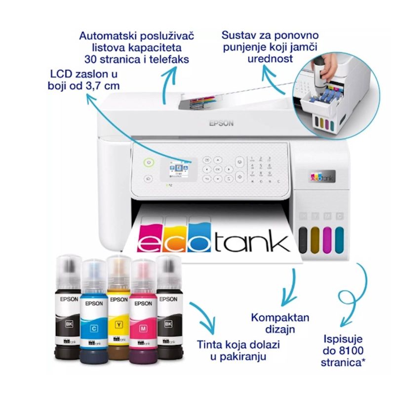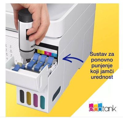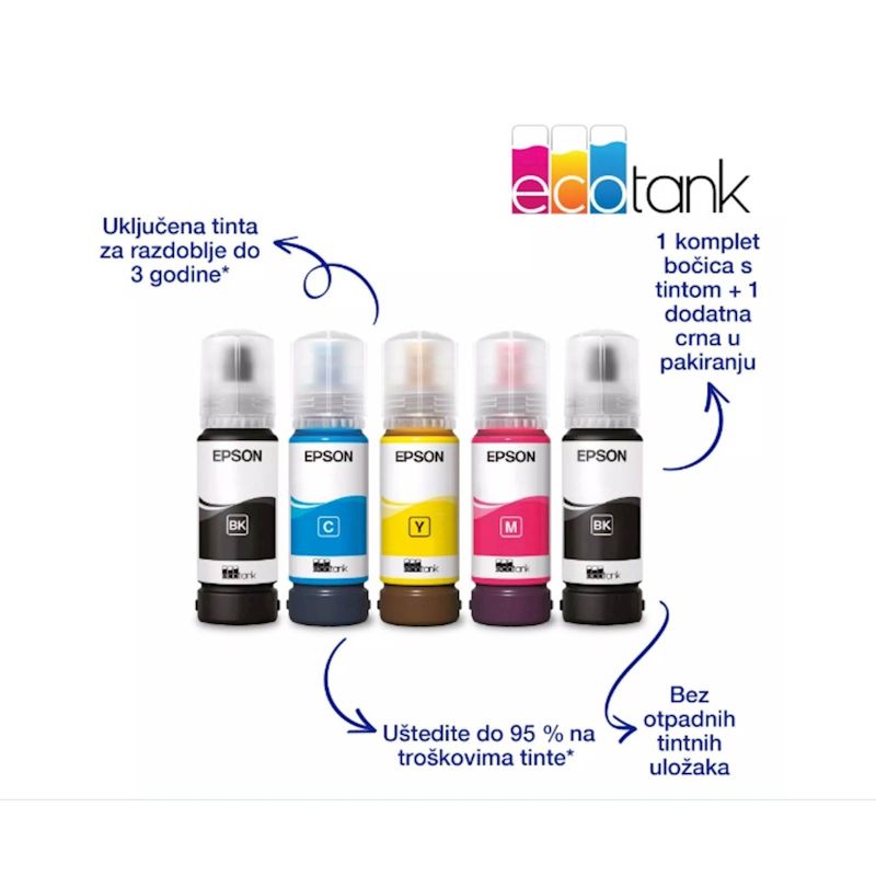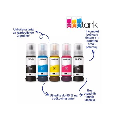 EcoTank osigurava ispis bez muke za domove i male urede – spremnici za tintu velike zapremnine omogucuju nadopunjavanje bez nereda, a poseban dizajn bocica osmišljen je tako da se mogu umetnuti samo ispravne boje. Aplikacija Epson Smart Panel omogucuje vam potpuno upravljanje pisacem s pametnog uredaja. Možete ispisivati, kopirati i skenirati dokumente i fotografije, postaviti, nadgledati i rješavati probleme sa svog telefona ili tableta. Uz tehnologiju bez topline Micro Piezo možete uživati u smanjenoj potrošnji energije i manjoj potrebi za zamjenskim dijelovima. Glava pisaca takoder je predinstalirana, pa se pisac postavlja bez muke.