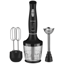 Štapni mikser sa posudom, snaga motora 1000 W, kapacitet posude 0.8 lit., funkcije: blender, sjeckalica, mikser, normal i turbo brzina, štap blendera od nehrđajućeg čelika, oštrice od nehrđajućeg čelika, tihi rad, ergonomska ručka, kompaktan dizajn za praktično skladištenje