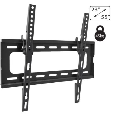 Zidni nosač za TV prijemnike od 23 " do 55", maximalno opterećenje 45 kg, udaljenosto od zida 24 mm, tilt 0-15°, VESA 100x100, 200x100, 200x200, 300x200, 300x300, 400x200, 400x300, 400x400, jednostavno za montažu i rukovanje, sadrži set vijaka, libelu i upute za uporabu