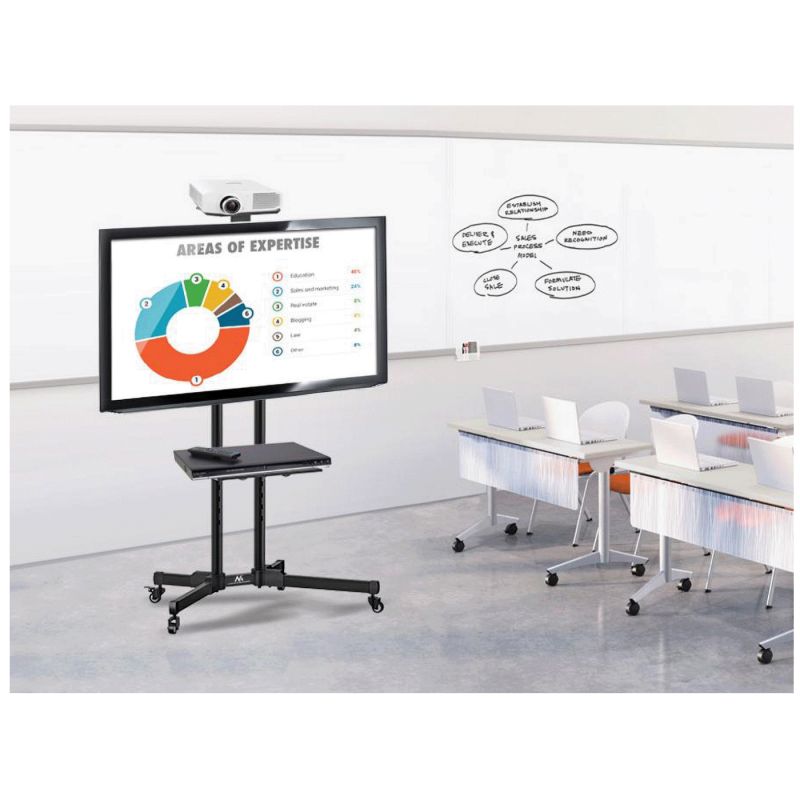 Četiri kotača za amortizaciju (gumirani) omogućuju vam da lako izdržite težinu opreme, a istovremeno omogućuju učinkovito manevriranje i jednostavno postavljanje stola. Stalak također ima integrirani sustav maskiranja kabela. Savršen stol za konferencijske sobe, zračne luke, javne izložbe ili druge profesionalne prezentacije.