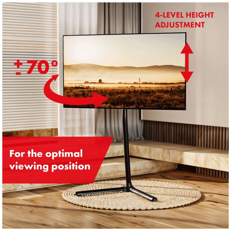 Osim toga, ergonomski dizajn stalka omogućuje jednostavno uklapanje u različite dizajne interijera, a podešavanje visine u 4 položaja i podešavanje zakretanja omogućuje korisniku da prilagodi položaj televizora prema svojim potrebama.