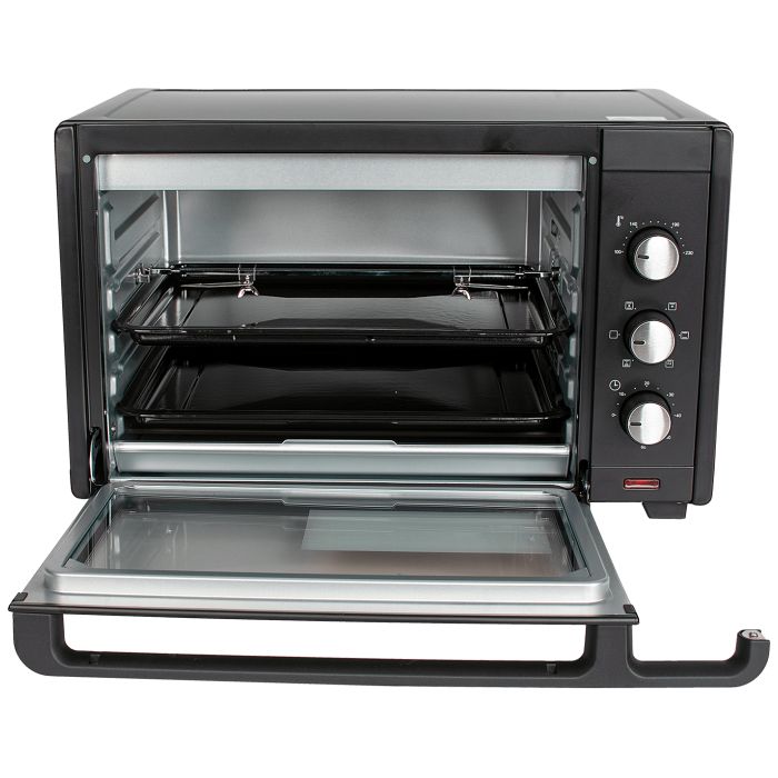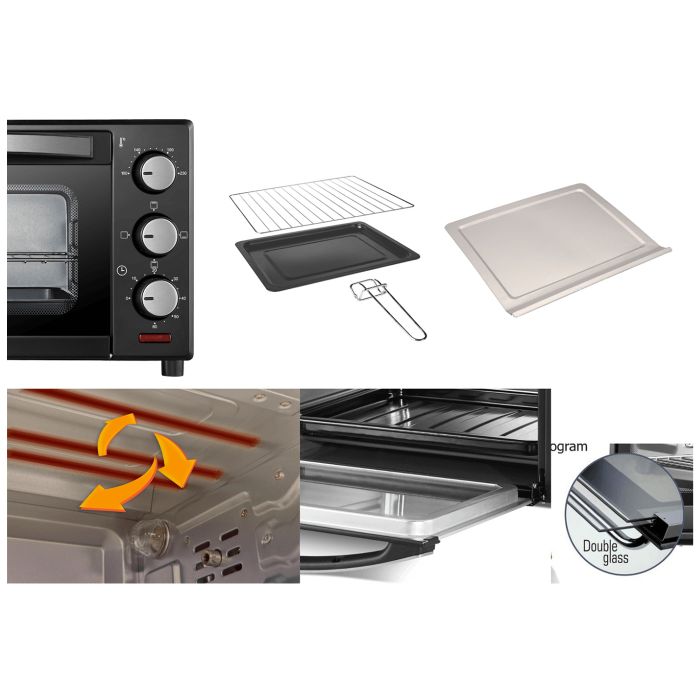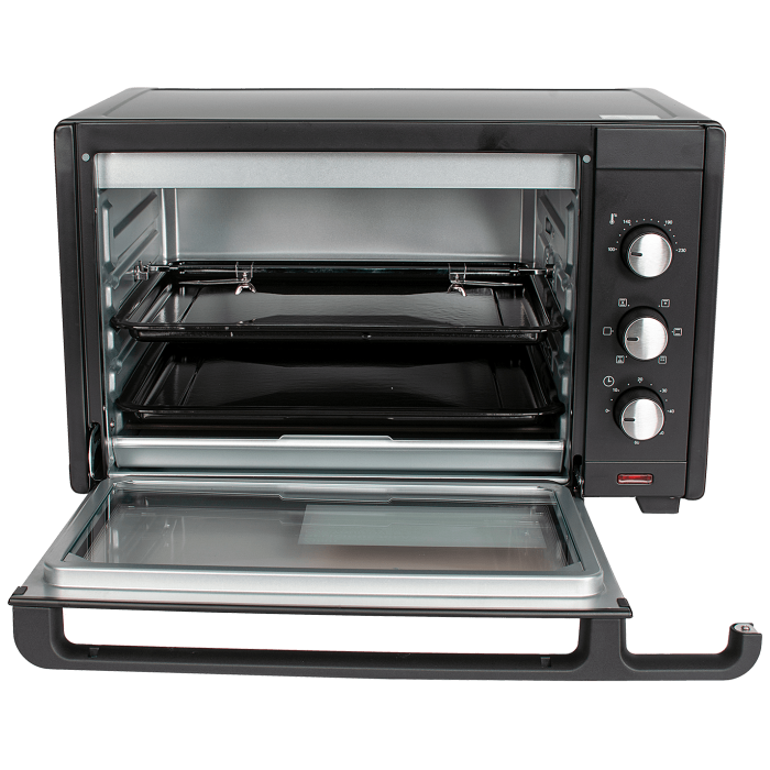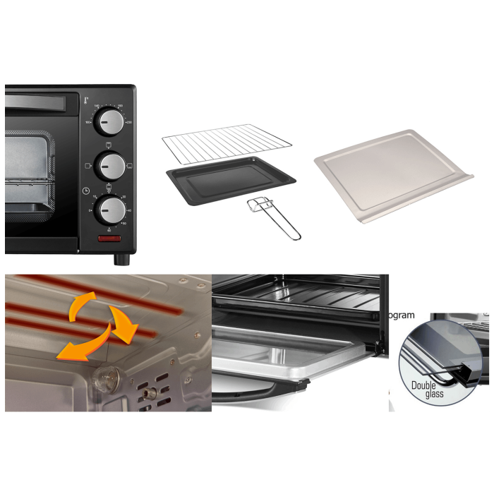 Mini pećnica sa grillom, snaga 2000 W, zapremina 45 lit., podesiva temperatura pečenja 100 - 230 °C, odabir 6 načina rada, 60-minutnim timer, dvostruko ostakljena vrata, unutarnje osvjetljenje, grill, grijač od nehrđajućeg čelika, dimenzije 560 x 420 x 350 mm