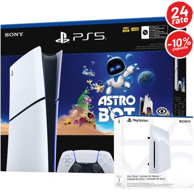Nova PlayStation 5 Slim Digital Edition (D-chassis) donosi moćnu tehnologiju PS5 u kompaktnijem i elegantnijem dizajnu, sada uz dodatni PlayStation Disc Drive i popularnu igru Astro Bot.