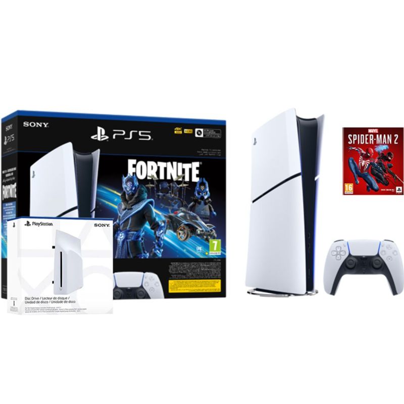 PlayStation 5 Slim Digital Edition (D-chassis) + PlayStation Disc Drive + Fortnite + Marvel’s Spider-Man 2