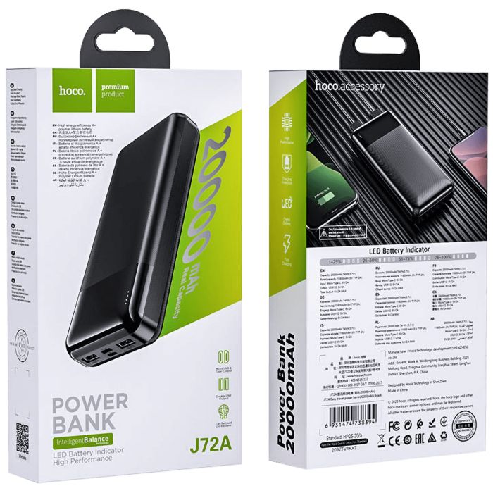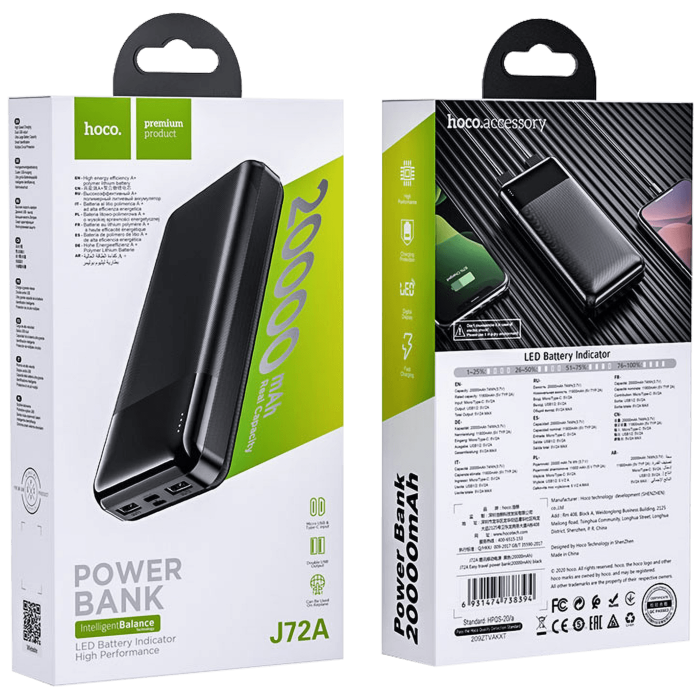 Prijenosni punjač za mobitel, J72A Power Bank, 20000mAh, 74Wh, nazivni kapacitet 11800 mAh