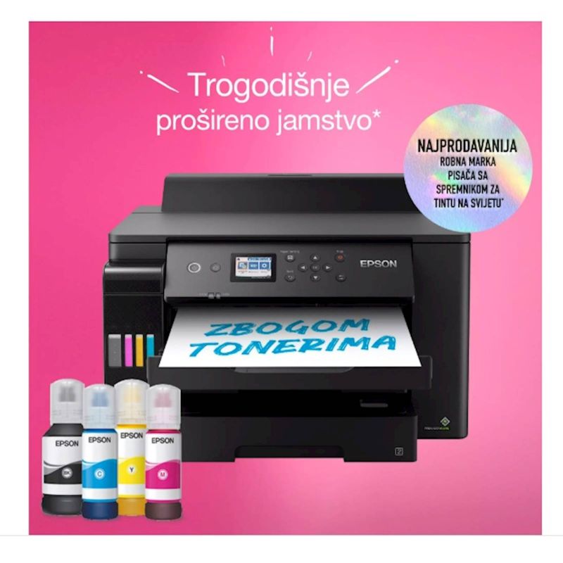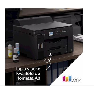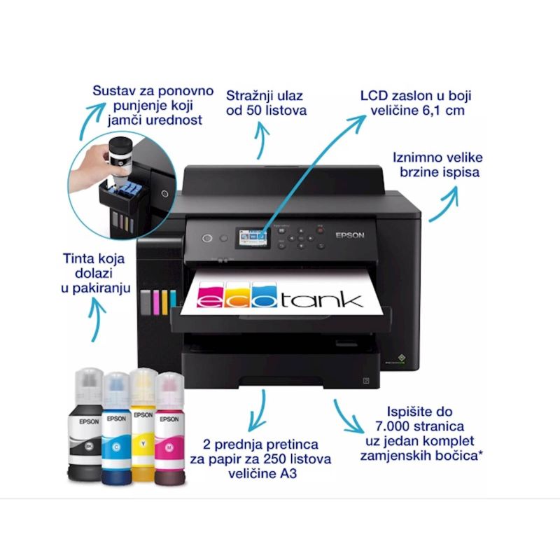 Printer EcoTank L11160 je za korisnike u malim uredskim okruženjima i poduzecima sa širokim rasponom znacajki omogucuje izvršavanje zadataka u formatu A3+ uz nizak trošak po stranici. Zadaci u formatu A3+ mogu se brzo izvršavati zahvaljujuci velikim brzinama ispisa, dvama prednjim pretincima za 250 listova formata A3 i stražnjem ulaganju za 50 listova formata A3. Ispisujte kako god želite uz mobilno ispisivanje, Ethernet i LCD zaslon od 6,1 cm.