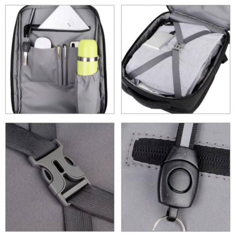 Ruksak posjeduje poseban pretinac za laptop, kao i dodatne unutrašnje i vanjske džepove za dokumente, pribor, punjače i ostale sitnice. Ugrađeni USB konektor omogućava praktično punjenje mobilnih uređaja u pokretu (uz powerbank). Izrađen je od izdržljivog poliestera, a ojačani leđni dio i naramenice pružaju udobnost pri nošenju i smanjuju opterećenje tokom dužeg korištenja.