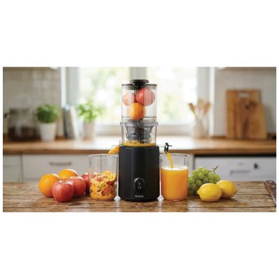 Veliki otvor za ubacivanje omogućava korištenje cijelih plodova bez prethodnog rezanja, što značajno ubrzava pripremu. Uređaj automatski odvaja pulpu u poseban spremnik, dok čisti sok izlazi u zasebnu posudu. Jednostavan je za korištenje, a odvojivi dijelovi perivi u mašini za suđe olakšavaju čišćenje i održavanje.