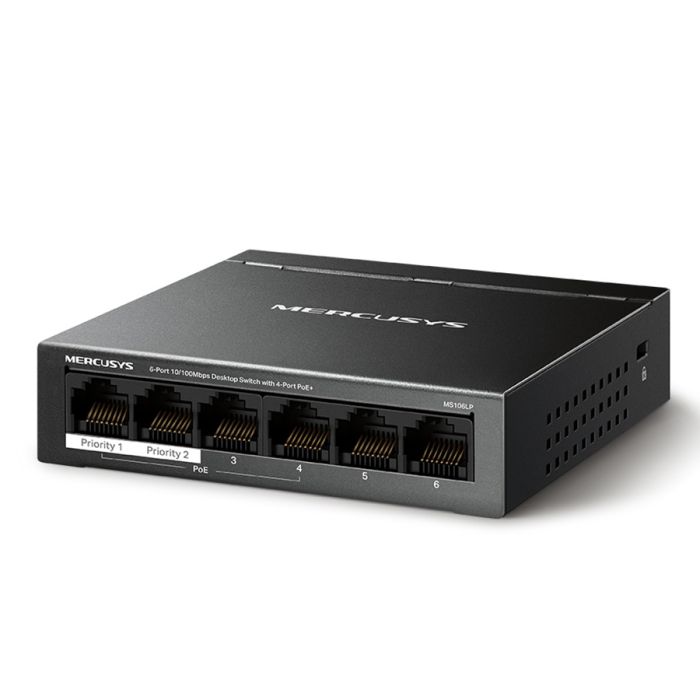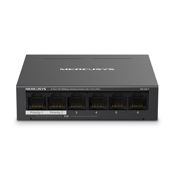 Mercusys MS106LP 6-portni 10/100 Mbps Desktop prekidač sa 4-porta PoE+, kompatibilan sa 802.3af/at PD-ovima, 40 W PoE napajanje, stolno čelično kućište, montiranje na zid, prošireni način rada za 250m PoE prijenos, prioritetni port 1-2 Mode, PoE Auto Recovery