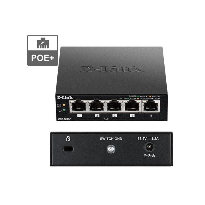 DGS-1005P/E, 5x 10/100/1000Mbps, 4 PoE ports (Ports 1-4), POE budget 60W, desktop, fiksna konfiguracija, unamanaged, Layer 2, vanjsko napajanje