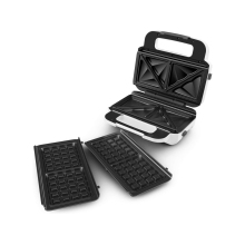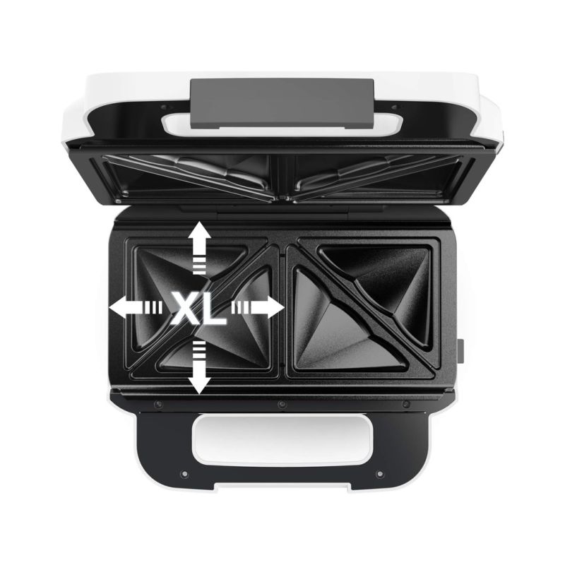 Tefal toster SW701110 Snack XL.Velike ploče,šire su i dublje od klasičnih tostera,za obilno punjene sendviče.Dvije zamjenjive ploče za pretvaranje tostera u aparat za vafle.Perive ploče u sudomašini.Snaga 850W.