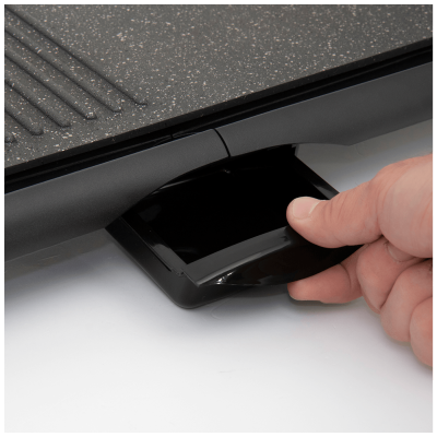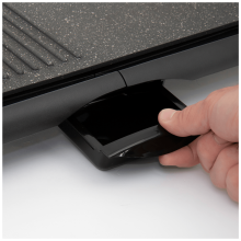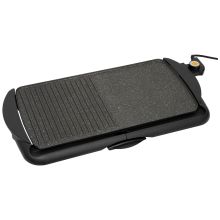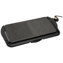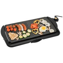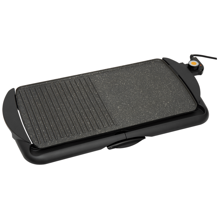 Električni grill, snaga grijača 2000W, grejna površina 52 x 26.5 cm, brzo zagrijavanje, rebrasta i glatka površina sa slojem protiv ljepljenja namirnica, termostat, podesiva temperatura pečenja, odvojiva posuda za skupljanje masnoće, plastične ručke otporne na toplinu, stabilan plastični stalak sa gumenim nogama, jednostavno za održavanje, dužina napojnog kabela 0.8 met., dimenzije 620 x 85 x 32 mm, napajanje 230 V ~ / 50 Hz