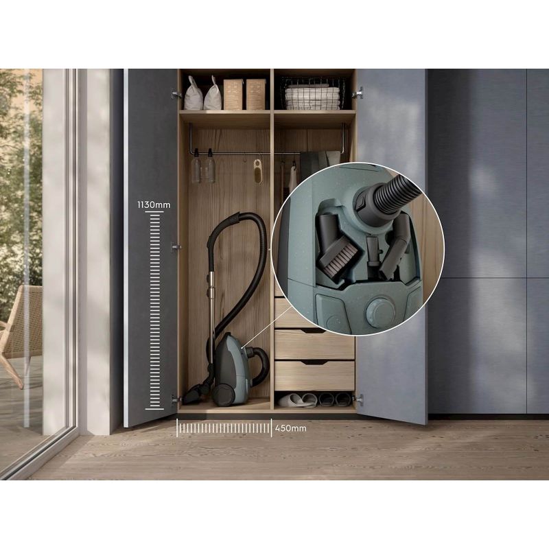 Naš najkompaktniji usisavac s vrecicom koji ucinkovito skuplja prašinu i prljavštinu sa svih površina – svakim potezom. Cetka All Floor lako se prebacuje izmedu cišcenja tvrdog poda i tepiha, a dodatna oprema nalazi se na samom usisavacu kako bi bila pri ruci kada zatreba. Snažno skupljanje prašine. Svakim potezom. Zahvaljujuci teleskopskoj cijevi, velikim kotacima i radijusu cišcenja od 8,5 metara možete se lako kretati i cistiti bez prekida. Sustav visoke filtracije sposoban je filtrirati do 99,99 % cestica prašine i grinja velicine cak do 1 mikrona kako bi pružio cišci izlazni zrak.?