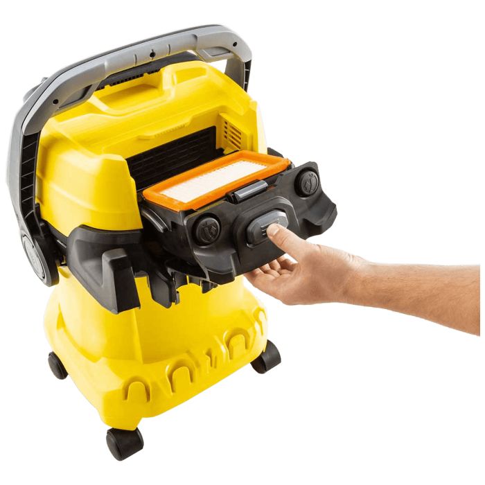 Plosnati naborani filtar prikladan je za neprekidno mokro i suho usisavanje bez potrebe za zamjenom filtera. Zahvaljujući patentiranoj tehnologiji uklanjanja filtera, filtar se može ukloniti za nekoliko sekundi, izbjegavajući svaki kontakt s prljavštinom. Gumb za čišćenje filtera može se pritisnuti za učinkovito čišćenje filtera i vraćanje snage usisavanja.