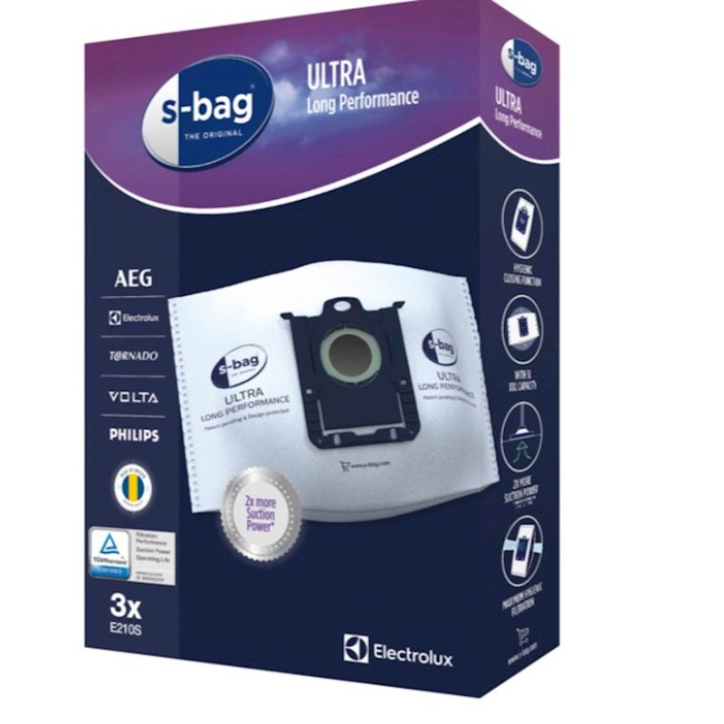 E210S S-bag ULTRA LONG PERFORMANCE vrecica za usisavac veceg kapaciteta s-bag® Ultra Long Performance traje 80 % dulje od tradicionalnih papirnatih vrecica za usisavac i ima optimalnu zapremninu od 5 litara. Ova vrecica pruža postojane vrhunske rezultate cišcenja tijekom mnogo duljeg vremena.